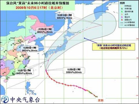 預(yù)計,“茉莉”將以每小時25公里左右的速度向偏北方向移動,7日將轉(zhuǎn)向東北方向移動,強度趨于減弱,并逐漸向日本中部沿?拷