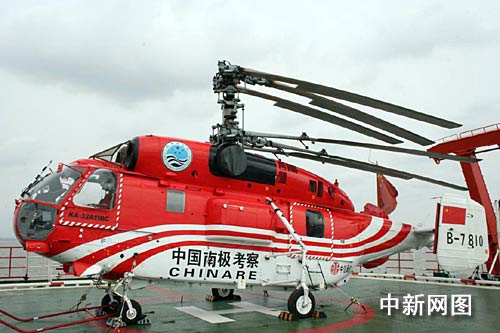 在“雪龍”號(hào)船尾的停機(jī)坪上,記者見(jiàn)到了中國(guó)南極考察首架自備卡-32直升飛機(jī)。由于在航行過(guò)程中需要存放在船上的機(jī)庫(kù)中,所以飛機(jī)螺旋槳的旋翼還未展開(kāi)。船員告訴記者,該型直升機(jī)吊掛能力可達(dá)4噸,是以前船載機(jī)型的4倍左右,成為南極地區(qū)目前使用的最大噸位直升機(jī)。它可直接進(jìn)行船岸之間來(lái)回運(yùn)輸,更好地滿足南極新老三座考察基地的物資保障需求。另外,“雪龍”號(hào)此次科考任務(wù)同樣將配備兩架直升飛機(jī),除了該架自備卡-32外,另外一架從國(guó)外租借的直升飛機(jī)將在新西蘭上船。