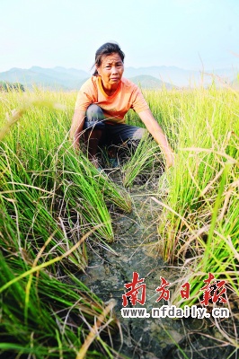 日前,韶關(guān)市仁化縣一種植戶看著自家的水稻田欲哭無淚,她家種植的9畝水稻因?yàn)榍锖祷臼。?jù)省防總介紹,入秋以來,廣東旱情繼續(xù)蔓延,旱情相對集中的地區(qū)主要有韶關(guān)的翁源、曲江、仁化,汕頭的南澳、潮陽等地。目前逾5萬群眾飲用水受影響,逾80萬畝農(nóng)作物受旱,其中重旱10.59萬畝、干枯1.16萬畝。(新華社)