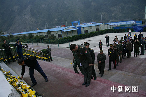 經(jīng)過簡單的接洽,武官們直接來到汶川縣漩口中學地震遺址,用軍禮向汶川大地震中的遇難者和英勇犧牲的烈士用表示崇高的敬意和深深的哀悼。在參觀遺址的過程中,軍官們紛紛用相機記錄著漩口中學的原貌,談?wù)撝氪暮蠡謴椭亟ǖ捏@人速度。其中一位武官用還算流利的普通話說:“汶川的映秀非常漂亮!建設(shè)得太好、太快了!”