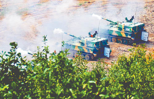 又是一連串震耳欲聾的巨響,“紅軍”前沿攻擊群開始對(duì)“藍(lán)軍”兩個(gè)高地重要目標(biāo)實(shí)施精確打擊。坦克、反坦克導(dǎo)彈車、迫擊炮輪番開火。