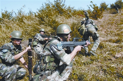 10時45分,當部隊行進到魯山縣熊背鄉(xiāng)三間房時,隨著一聲槍響,所有戰(zhàn)斗員立即進行隱蔽,并尋找戰(zhàn)機。一小股伏擊“敵人”剛一出現(xiàn),數(shù)十名戰(zhàn)斗員一起向“敵人”開火,一時間整個山谷槍聲、炮聲一片。不到1分鐘的時間,部隊便將其全部消滅。