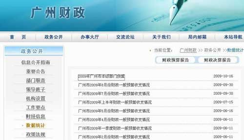 查詢方式為,登陸廣州財政網站()后,點擊打開“政務公開”欄目中的“數(shù)據(jù)統(tǒng)計”一欄(/zwgk/sjtj/index.htm),可以看到《2009年廣州市本級部門預算》的鏈接,打開之后為一個簡單的114個部門的索引列表。