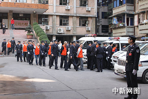 中新網(wǎng)重慶11月3日電(銀雪)重慶抓獲的十九個(gè)涉黑團(tuán)伙中唯一女首犯謝才萍3日上午一審宣判:謝才萍被控的組織、領(lǐng)導(dǎo)黑社會(huì)性質(zhì)組織罪、開(kāi)設(shè)賭場(chǎng)罪、非法拘禁罪、容留他人吸毒罪、行賄罪五宗罪成立,被判有期徒刑18年,并處罰金102萬(wàn)元人民幣。圖為判決后謝才萍團(tuán)伙成員走出法庭。
