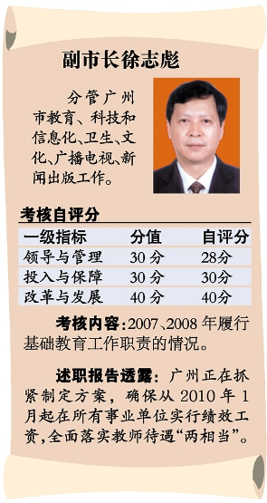 徐志彪在自評(píng)分說明中,給自己這兩年的工作成績(jī)都打了98分,并在述職報(bào)告中表示,廣州正在抓緊制定方案,確保從2010年1月起在所有事業(yè)單位實(shí)行績(jī)效工資,全面落實(shí)教師待遇“兩相當(dāng)”。