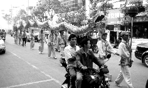 年輕人則拉起條幅,點(diǎn)燃了鞭炮。人們?cè)跅l幅的帶領(lǐng)下,向北開(kāi)進(jìn)。
