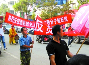 在奉開順舞龍的同時,月巖中路上,周加花和鄰居們也打起了“反貪反腐”的條幅,沿街道向東前進。