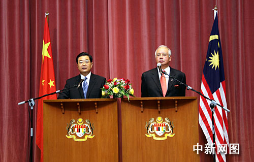 會(huì)談結(jié)束后,胡錦濤和納吉布出席兩國(guó)合作文件簽字儀式并共同會(huì)見(jiàn)記者。中午,胡錦濤出席納吉布舉行的午宴。