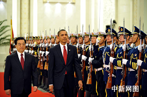 中新網(wǎng)北京11月17日電 (記者 張朔)中國國家主席胡錦濤17日上午約9點50分在人民大會堂北大廳舉行儀式,歡迎美國第44任總統(tǒng)奧巴馬對中國進行國事訪問。