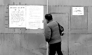 鐵門一側(cè)的墻上,貼著一張接待室遷址的通知,也已被撕得殘破不全。兩側(cè)搭建著10來個大大小小,形狀各異的塑料棚。一位衣衫襤褸的中年婦人從棚里彎腰走出來,“法院(接訪室)已經(jīng)搬啦,周六就關(guān)門了!彼龔囊路道锾统鲆粡堎徫镄∑贝笮〉耐ㄖ,上面印著搬遷通知以及新址乘車路線圖,通知落款為最高人民法院立案一庭。