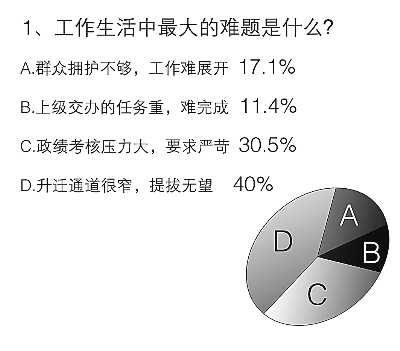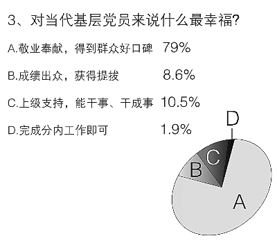 對當代基層黨員干部來說,在事業(yè)上什么是最幸福的?根據調查,79%的受訪者選擇了“敬業(yè)奉獻,得到群眾好口碑”,這說明在基層,群眾工作是最重要的方面。也有10.5%的干部更希望得到“上級支持,有一個‘能干事,干成事’的氛圍”。