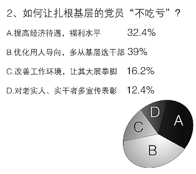 基層比較艱苦,基層比較復雜,被問到“如何讓扎根基層的共產黨員‘吃苦不吃虧’?”時,39%的受訪者更關注用人導向問題,他們認為應該優(yōu)化用人導向,多從基層選拔領導干部;選擇提高經濟待遇,福利水平的也占到了32.4%;值得注意的是,“更重視基層,改善工作環(huán)境,讓其大展拳腳”也受到關注,有16.2%的受訪者選擇了該選項。