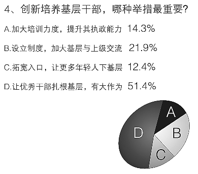 當被問到如何創(chuàng)新基層干部培養(yǎng)方式時,51.4%的受訪者選擇了“讓優(yōu)秀干部安心扎根基層,有大作為”,這說明基層雖苦,但在基層干部眼中卻是鍛煉干部最好的大學校,另外也表明了目前基層缺人才的現狀,熱切呼喚德才兼?zhèn)涞摹澳苋恕比ヮI導和管理。要解決這個問題,有21.9%的受訪者認為應該設立制度,加大基層與上級干部間交流。同時,12.4%的黨員干部把“拓寬入口,讓更多年輕人下基層”當作創(chuàng)新基層干部培養(yǎng)的首選。(梁昌杰、王慧)
