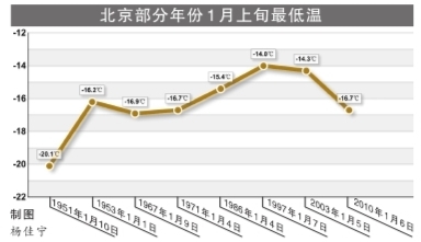 “最低氣溫-16.7℃”,昨天凌晨1點(diǎn),(北京)市氣象臺(tái)發(fā)布的數(shù)據(jù)顯示,繼5日的-15.6℃之后,昨天凌晨,南郊觀象臺(tái)監(jiān)測的最低氣溫跌至-16.7℃,刷新了38年來1月上旬最低溫度紀(jì)錄。根據(jù)預(yù)報(bào),這還不是今冬寒冷天氣的終結(jié),明天,全市可能普降小到中雪,最低氣溫仍將徘徊在-12℃左右。