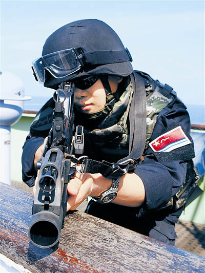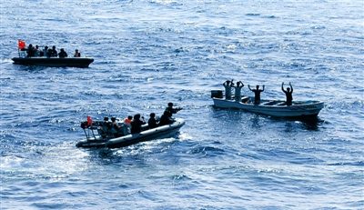12時28分,巢湖艦在艦載直升機的引導下鎖定了正在轉(zhuǎn)向“鴻達號”商船的疑似海盜快艇。在發(fā)射3枚信號彈予以警告后,疑似海盜快艇被迫停車,隨后趕到的馬鞍山艦迅速派出2艘小艇靠近,特戰(zhàn)隊員將其驅(qū)離。