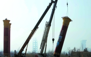 10點半,吊車首先將民族柱的水泥墩安放在鋼板上,然后將柱體吊起,對接在水泥墩上,并進行固定,將民族柱的冠頂安裝在柱體上。每根民族柱安裝約20多分鐘。
