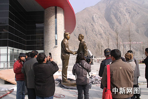 中新網(wǎng)汶川1月29日電(薛升玉 張瑤)1月29日上午,汶川縣體育館前鑼鼓陣陣,“咔嚓”的快門聲不斷,一尊高2.98米、寬1.68米、厚0.94米的“胡主席和溫總理在災區(qū)”大型雕塑吸引了許多過往群眾駐足留影。這尊由陜西省大荔縣宣傳部捐贈的大型雕塑,將收藏到汶川縣禹羌博物館。