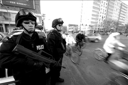 昨天上午,記者在西單文化廣場(chǎng)前看到,一輛武裝處突車(chē)閃爍著警燈?吭诼放,兩名身著作戰(zhàn)服的特警隊(duì)員全副武裝,警覺(jué)地注視著長(zhǎng)安街附近的人流和車(chē)流。