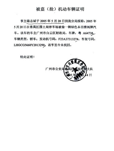 該博文還附了幾張文件的掃描圖作為證明。一張成交日期剛好是2005年5月20日的由番禺區(qū)國土房管局開出的《契稅完稅證》,納稅人為“駱×”,房地產(chǎn)位置為錦繡香江花園××園×街×號;一張六天后廣州市國土房管局開出的同處房產(chǎn)的《房地產(chǎn)權情況證明》,權屬人為“駱×”,但備注注明共有人為韓××及駱志斌;一張廣州市公安局番禺分局刑警大隊開出的《被盜(搶)機動車輛證明》(見左圖),上寫駱志斌于2005年5月20日到該分局報案稱,本田雅閣汽車當天在番禺區(qū)國土局停車場被盜。網(wǎng)友注明,“駱×”為駱志斌的公子。另外,網(wǎng)友還附了一張房產(chǎn)圖片,稱錦繡香江花園同樣位置的別墅在2006年已賣到每平方米3萬元。
