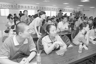 2009年8月26日,福建省廈門市,2009年秋季外來務(wù)工人員子女就讀公辦小學(xué)派位現(xiàn)場,家長焦急地看著派位結(jié)果。廈門市思明區(qū)和湖里區(qū)舉行秋季公辦小學(xué)一年級(jí)招收進(jìn)城務(wù)工人員子女入學(xué)的電腦派位。兩區(qū)共計(jì)有3142名進(jìn)城務(wù)工人員子女被派入公辦小學(xué)。