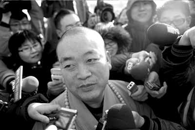每次人大代表“走紅地毯”時(shí),圓臉?lè)蕉、身穿黃色袈裟、足蹬黑色布鞋的全國(guó)人大代表、少林寺方丈釋永信一出現(xiàn)在廣場(chǎng)上就會(huì)被記者團(tuán)團(tuán)包圍,“方丈,聽說(shuō)你開越野車”“方丈,你現(xiàn)在是住在大別墅了吧?”……面對(duì)大家拋出的各種問(wèn)題,他不急不惱,邊低聲念“阿彌陀佛”邊試圖向密不透風(fēng)的人墻外移動(dòng)。見(jiàn)叱咤少林寺的大師卻被眾人圍堵得步履維艱,好事者喊了句“大師,用輕功啊”!大師就是大師,面對(duì)記者們刁鉆的問(wèn)題,他往往用微笑代替回答,“我知道,就算我不說(shuō)話,也會(huì)成為新聞”。
