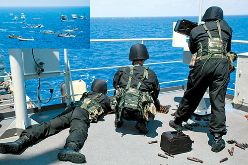 10時(shí)05分,“微山湖”艦特戰(zhàn)隊(duì)員和反海盜分隊(duì)按部署就位。指揮員下令發(fā)射信號(hào)彈進(jìn)行警告,但數(shù)艘可疑快艇繼續(xù)向編隊(duì)靠近。10時(shí)39分,沖在最前面的幾艘快艇已接近至“微山湖”艦左舷5鏈(925米)處。指揮員果斷下令,使用重機(jī)槍進(jìn)行警告攔阻射擊(見上圖,左上角為可疑快艇)!班睒屄曧懫,可疑快艇停止了前進(jìn),不久便調(diào)頭離去!拔⑸胶迸炛匦抡{(diào)整航向,于當(dāng)?shù)貢r(shí)間3月21日凌晨將“振華9號(hào)”護(hù)送至安全海域。