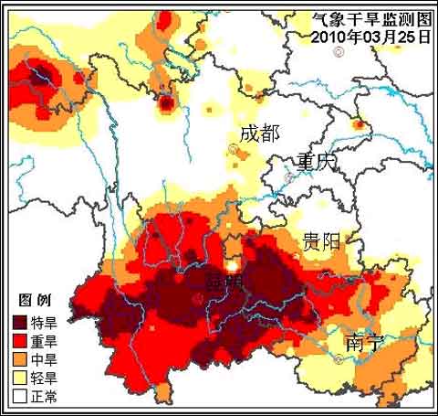 3月25日氣象干旱監(jiān)測(cè)顯示,云南、貴州西部和南部、廣西西部和北部、川西高原南部等地存在中度以上氣象干旱;其中云南大部、貴州西南部、廣西西北部、川西高原南部等地存在重度以上氣象干旱。