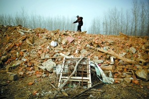 3月29日,陶興堯屋子只剩下被拆后的廢墟,屋子南側(cè)丟著四個半米高的紅色滅火器。