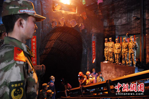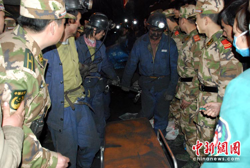 4月1日14時07分,一名生命垂危的礦工在救援分隊的搶救下順利升井,擔負救援任務的武警官兵迅速接過擔架,快速將病危礦工抬上救護車。