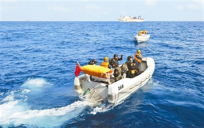 當(dāng)?shù)貢r(shí)間11日9時(shí),中國(guó)海軍第五批護(hù)航編隊(duì)“廣州”艦上,16名特戰(zhàn)隊(duì)員和2名取證人員全副武裝,分別乘直升機(jī)和小艇前往“永歡”、“孔雀松”、“龍發(fā)”和“華強(qiáng)”等4艘中國(guó)商船執(zhí)行隨船護(hù)衛(wèi)任務(wù)。本報(bào)記者作為攝像取證人員首次與4名特戰(zhàn)隊(duì)員一起,登臨中遠(yuǎn)公司所屬的散貨船“永歡”號(hào)執(zhí)行為期3天的隨船護(hù)衛(wèi)任務(wù)。