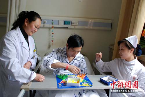 山大一院綜合科的第3病室里,42床的高二輝正在和心理治療師樊艷麗、護(hù)士段瑞云下跳棋。