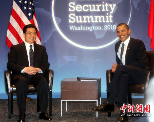 中新社華盛頓4月12日電 (記者 張朔 吳慶才)中國國家主席胡錦濤當?shù)貢r間12日下午在華盛頓會見美國總統(tǒng)奧巴馬,雙方就中美關(guān)系及共同關(guān)心的重大國際和地區(qū)問題交換了意見,達成重要共識。胡錦濤就下階段中美關(guān)系發(fā)展提出5點重要主張。
