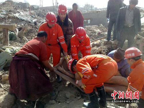 15日凌晨0:40分,什邡救援隊接到玉樹州抗震救災(zāi)指揮部命令,前往玉樹州玉樹縣結(jié)古鎮(zhèn)結(jié)古寺參與救援。什邡救援隊隊員們不辭辛勞,在廢墟中發(fā)現(xiàn)一名中年婦女,尚有氣息,隊員們立即展開救援,經(jīng)過約40分鐘的緊張施救,順利地將其救出,經(jīng)簡單的救治后,立即送往醫(yī)療隊救治。
