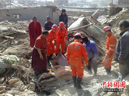 救援隊到達(dá)后玉樹縣后,首先趕到結(jié)古鎮(zhèn)“玉樹州綜合民族職業(yè)學(xué)!笨逅F(xiàn)場,并立即展開搜救。據(jù)了解,該職業(yè)中學(xué)的三層電教樓全部垮塌,下面還有10余名學(xué)生被埋。什邡市安全生產(chǎn)應(yīng)急救援大隊搶險隊員運(yùn)用專業(yè)工具馬上進(jìn)行施救。經(jīng)過一夜緊張救援,被埋壓在職業(yè)學(xué)校電教大樓下的6名學(xué)生遺體被挖出,搜救仍在繼續(xù)。