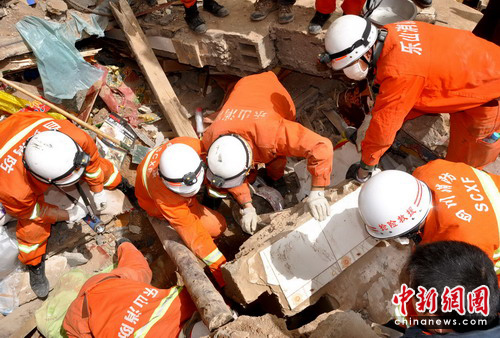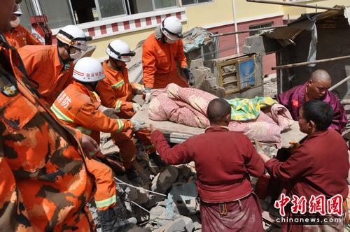 中新網(wǎng)成都4月17日電(肖洪環(huán))4月16日,玉樹7.1級地震救援進入第三天,也是“黃金72小時”的關(guān)鍵時機,四川消防鐵軍官兵按照溫家寶總理的指示,堅持“救人第一”的原則,利用生命探測儀、搜救犬和“喊、聽、問、看”等方式在廢墟下努力搜尋幸存者,不放過任何一個角落,不放棄任何一絲希望,全力以赴救援,展開了生命大營救,尤其是在縣城扎西巷一個居民樓救援現(xiàn)場發(fā)生的那一幕幕感人致深的場景,讓人們繼“5.12”以來再一次次地感受到人間最偉大的“母愛”,以及救援人員對生命、對逝者、對民族的尊重,在難救援現(xiàn)場處處彰顯出“災(zāi)難無情、人間有情”的“大愛”。