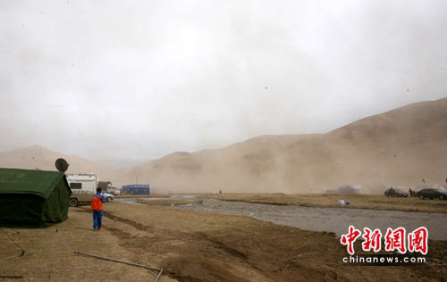 中新網(wǎng)青海玉樹4月19日電(記者劉忠俊)19日,青海玉樹地震災(zāi)區(qū)的天氣可以說是一天多變,大風狂暴吹起地上塵土,天地一片昏暗。不到幾分鐘又下小雨,過后又出大太陽。大風造成災(zāi)民以及救援隊的一些帳篷被吹倒,一醫(yī)療點的兩帳篷被大風吹到20米外,造成帳篷里的兩位醫(yī)生和一名記者受傷,其中記者傷得不輕。