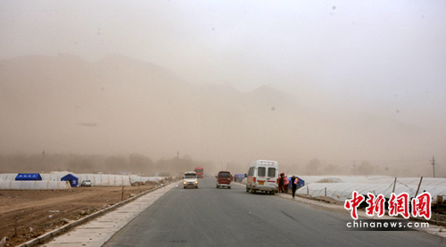 地震發(fā)生后,玉樹惡劣天氣頻頻出現(xiàn),幾乎天天都要出現(xiàn)沙塵暴。記者來到災(zāi)區(qū)后,第一感覺就是這里風沙大,一天要刮幾次大風。風沙吹在的人眼睛都睜不開,災(zāi)民安置區(qū)內(nèi)天昏地暗,居住的帳篷內(nèi)床上,吃飯的碗,臉盆里,電腦上都是灰塵。
