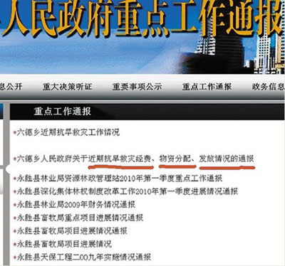 打開麗江市、縣政務(wù)網(wǎng),記者發(fā)現(xiàn)永勝縣六德鄉(xiāng)政府一份看似不起眼的“通報(bào)”,該通報(bào)也是目前記者在麗江“網(wǎng)絡(luò)問政”過程中發(fā)現(xiàn)的麗江市鄉(xiāng)級(jí)政府相關(guān)抗旱救災(zāi)款物流向通過政務(wù)網(wǎng)向社會(huì)公開唯一鄉(xiāng)政府。