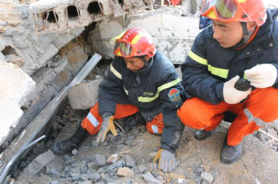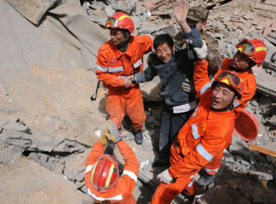 國家救援隊在到達玉樹機場后,救援隊員火速前往受災最重的玉樹縣城結古鎮(zhèn)。全體救援隊員挑燈夜戰(zhàn),齊心協(xié)力營救出2名幸存者。雖初戰(zhàn)告捷,但救援隊員不敢絲毫松懈,因為廢墟還有更多生命等待我們。只要有一線希望,我們就會盡百倍努力,“不拋棄,不放棄”。