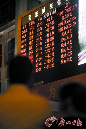 “已經(jīng)等了3個多小時了。我是請假陪女兒去旅游的,現(xiàn)在多掃興!编w女士在電話中對記者抱怨。鄔女士原本打算乘坐晚上8時05分的廣州至張家界列車。7時許,她和女兒趕至候車大廳,隨即被告知受災(zāi)情影響,列車晚點了。鐵路工作人員告訴乘客,可以全額退票,也可換第二日的票!爱(dāng)時很多人涌去了退票窗口,上千人擠在一起,很壯觀,跟春運一樣。由于退票換票的人實在太多,與此同時,廣場大屏幕開始滾動顯示受到影響晚點的列車。晚上9時許,鄔女士決定退票,被鐵路工作人員告知,她們乘坐的列車可能今晚就會開出。“我是特意請假陪女兒去旅游的,今晚能開車那我肯定不愿意退票了!庇谑,鄔女士母女決定繼續(xù)等。但直至晚上10時,她們還是沒能上車。此時,由于陸續(xù)有列車開車,廣場上的人流少了一半。盡管郁悶,但鄔女士還是顯得很有耐性。“不過有人開始發(fā)脾氣扔行李了。”鄔女士告訴記者。