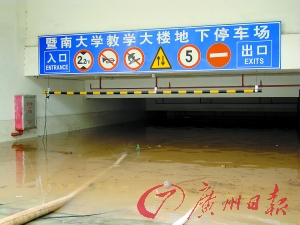 昨日中午,在暨南大學南門教學樓的地下停車場,褐紅色的水淹沒了整個車庫。“40多輛車在里頭,全完了!币幻吣洗髮W的老師告訴記者,這個地下車庫約有4米高,水涌出來,接近外面的地面高度,里頭的車完全沒頂了,“就我們知道的,里頭有1輛才買了3個月的奔馳,還有大半都是才買了一兩年的新車,太可惜了!濒叽罂倓蘸笄诠芾硖幪庨L張安國表示,這可算是暨大20年來最嚴重的一次水浸!八蛞蔀閸忢斉潘こ碳軜(gòu)不良,引起‘倒灌’!(記者黃茜、陸建鑾 通訊員陳文舉、邢曉雯)