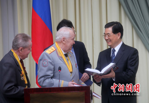 胡錦濤向俄羅斯老戰(zhàn)士們發(fā)表講話,并向他們頒發(fā)“和平”獎?wù)潞妥C書。