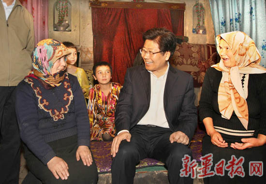 “你好啊,我從烏魯木齊來看望大家!”5月9日下午,新疆維吾爾自治區(qū)黨委上午在烏魯木齊舉行的北疆片區(qū)座談會剛一結(jié)束,自治區(qū)黨委書記張春賢立即趕往喀什,看望各族群眾,就有關(guān)民生工程建設(shè)進行調(diào)研。一下飛機,來不及休息,張春賢就驅(qū)車前往喀什市多來提巴格鄉(xiāng)14村。走進村民玉蘇甫·艾買提的院落,張春賢便上前握住他的手說。
