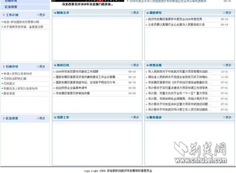 記者隨即登錄武漢市發(fā)改委政務(wù)公開(kāi)網(wǎng)站。在該網(wǎng)站首頁(yè)記者發(fā)現(xiàn),除“來(lái)信選登”一欄開(kāi)天窗以外,其它欄目的信息更新還比較及時(shí)?僧(dāng)記者點(diǎn)擊進(jìn)入子欄目時(shí),就不是那么回事了!俺R(jiàn)問(wèn)題匯總”、“表格下載”、“項(xiàng)目稽查”、“財(cái)政公開(kāi)”等十幾個(gè)子欄目,均無(wú)任何內(nèi)容,只有大片空白。此外,在市民具體辦事的“業(yè)務(wù)專(zhuān)欄”欄目下,24個(gè)子欄目?jī)?nèi)容驚人地一致,幾乎全是空白框架。