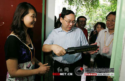 上午8時20分,梅克保在湖南省政府黨組成員、省教育廳廳長張放平,長沙市委副書記、市長張劍飛,省教育廳黨組成員、省教育考試院院長陳最華的陪同下,來到長沙市一中考點檢查,考生們正井然有序地通過安檢進(jìn)入考室。梅克保仔細(xì)查看了考室外張貼的參考的學(xué)生信息,上面照片、準(zhǔn)考證號、身份證號等一應(yīng)俱全。
