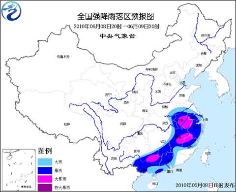 預計,6月8日20時到6月9日20時,河南南部、湖北東部、安徽、江蘇西部、湖南南部、江西、浙江、福建中北部、廣西、廣東中西部的部分地區(qū)有大到暴雨,其中,安徽南部、江西東北部、福建北部、廣西東北部等地的局部地區(qū)有大暴雨;上述部分地區(qū)還將伴有短時雷雨大風等強對流天氣。