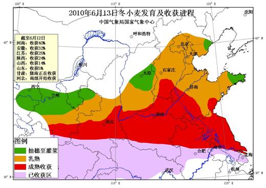 目前,安徽中北部、江蘇大部、河南中北部、陜西南部和關(guān)中、甘肅隴南、山西西南部、山東西部和南部、河北南部、新疆西南部冬小麥處于成熟收獲期;山東中東部、河北大部、山西南部、陜西中北部、甘肅隴東大部、新疆南部偏東地區(qū)冬小麥處于乳熟期;山東半島東部、河北東北部、山西中部、甘肅隴中和隴東西北部、新疆北部冬小麥處于抽穗至灌漿階段。