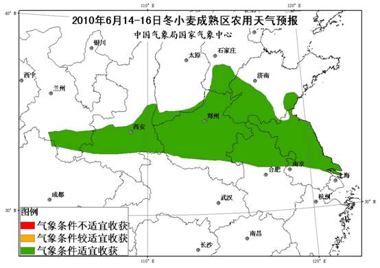 預(yù)計(jì)6月14-16日,陜西南部和關(guān)中、山西西南部、河北南部、河南中北部、山東西部和南部、安徽中北部和江蘇麥?zhǔn)諈^(qū)以晴到多云天氣為主,適宜冬小麥?zhǔn)斋@晾曬和夏播作物播種。