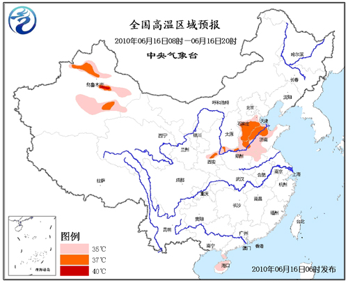 預(yù)計,今天白天,河北南部、天津西南部、山西西南部、河南北部、山東北部和西部、安徽北部、陜西關(guān)中地區(qū)以及廣東雷州半島、海南大部將有35~37℃的高溫天氣,其中,河北南部部分地區(qū)的最高溫度可達38℃;新疆北疆盆地以及南疆盆地將有35℃以上的高溫天氣,其中,吐魯番盆地最高氣溫可達40~43℃。