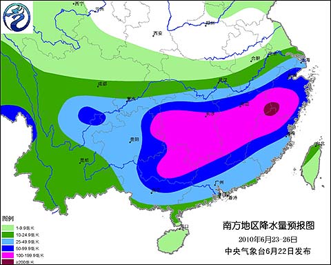 預(yù)計23日至26日,江淮、江南、華南大部以及西南地區(qū)東部等地又將出現(xiàn)一次強(qiáng)降雨過程。貴州東部、湖南、江西、浙江、福建、廣西、廣東北部有大到暴雨,局部地區(qū)有大暴雨,并將伴有短時雷雨大風(fēng)等強(qiáng)對流天氣;過程降雨量有50-120毫米,局部地區(qū)可達(dá)150-260毫米。湖南、江西、福建、廣西等地的汛情將進(jìn)一步發(fā)展,建議各地、各有關(guān)部門及時采取措施,加強(qiáng)防范區(qū)域性洪澇災(zāi)害和嚴(yán)重次生災(zāi)害。